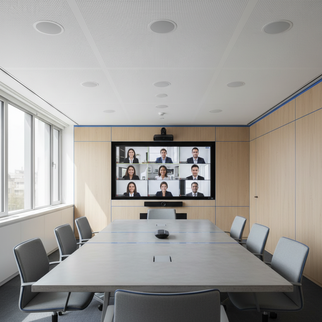 Diseñamos e instalamos salas de reuniones preparadas para videollamadas claras y profesionales: imagen nítida, audio limpio y una experiencia sencilla para cualquier usuario.